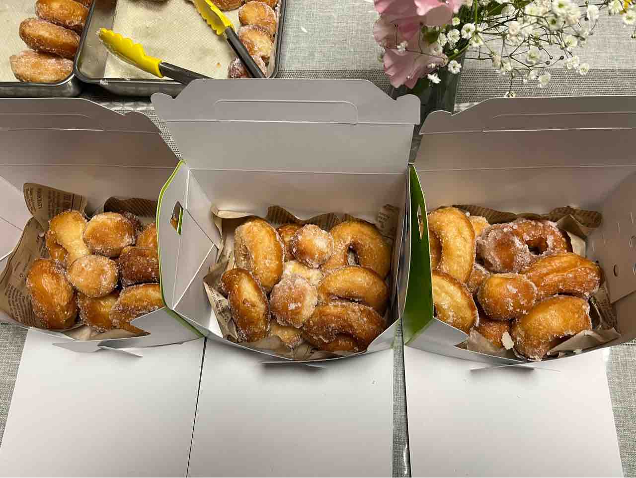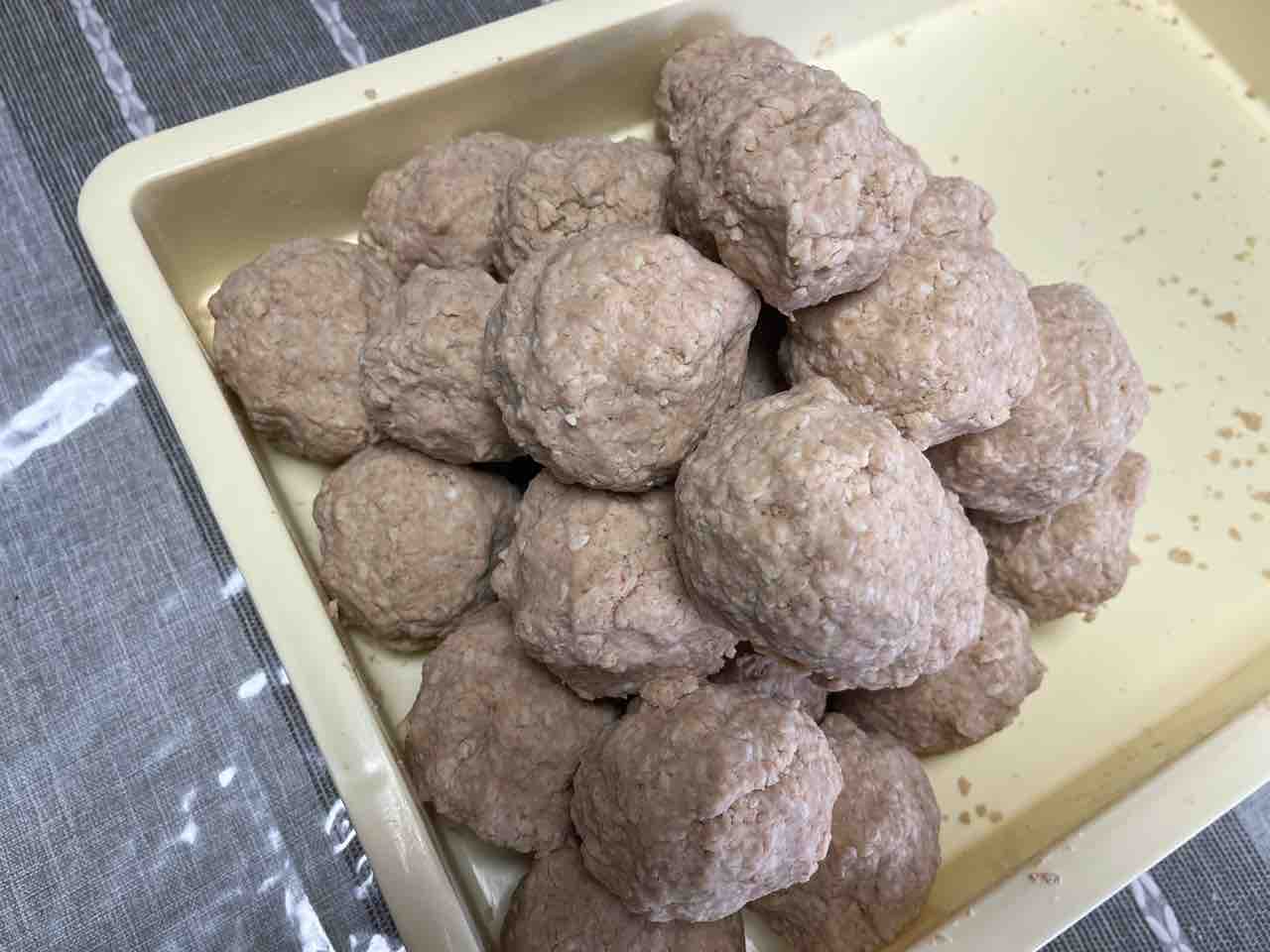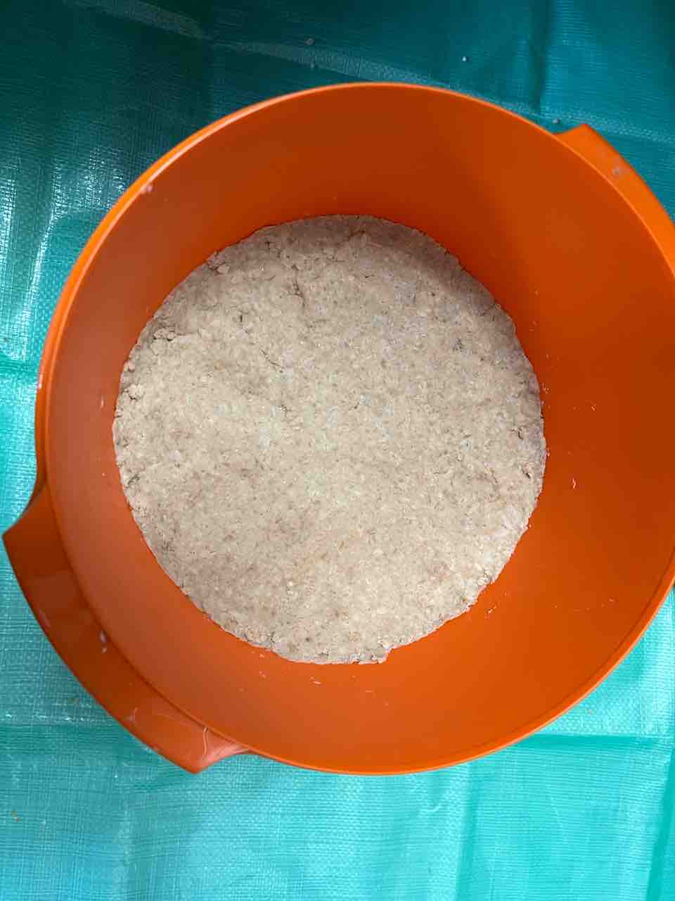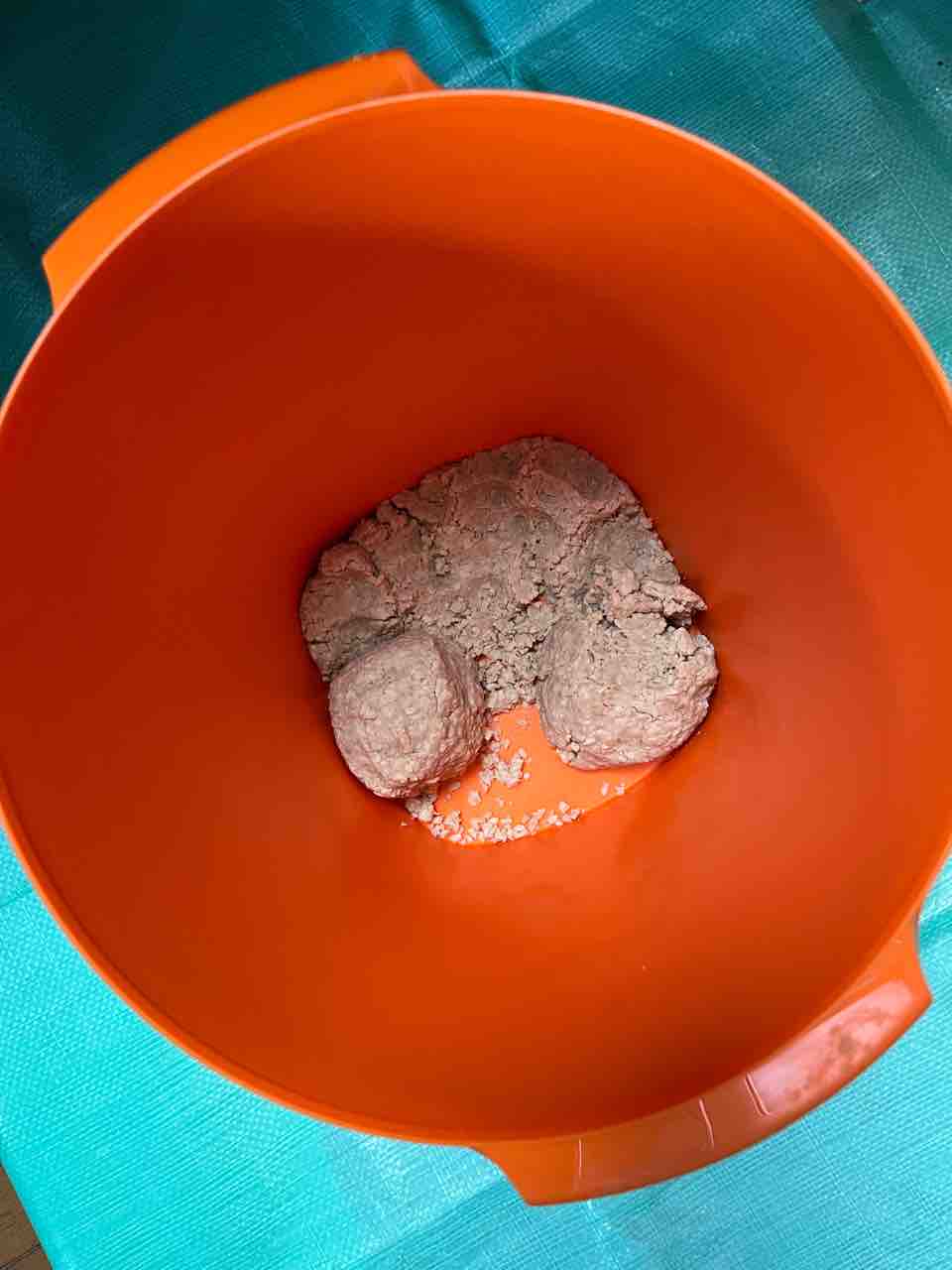 ボールに粉類、水、卵を入れて混ぜたら、キムチ、春菊、桜エビも合わせて生地を作る