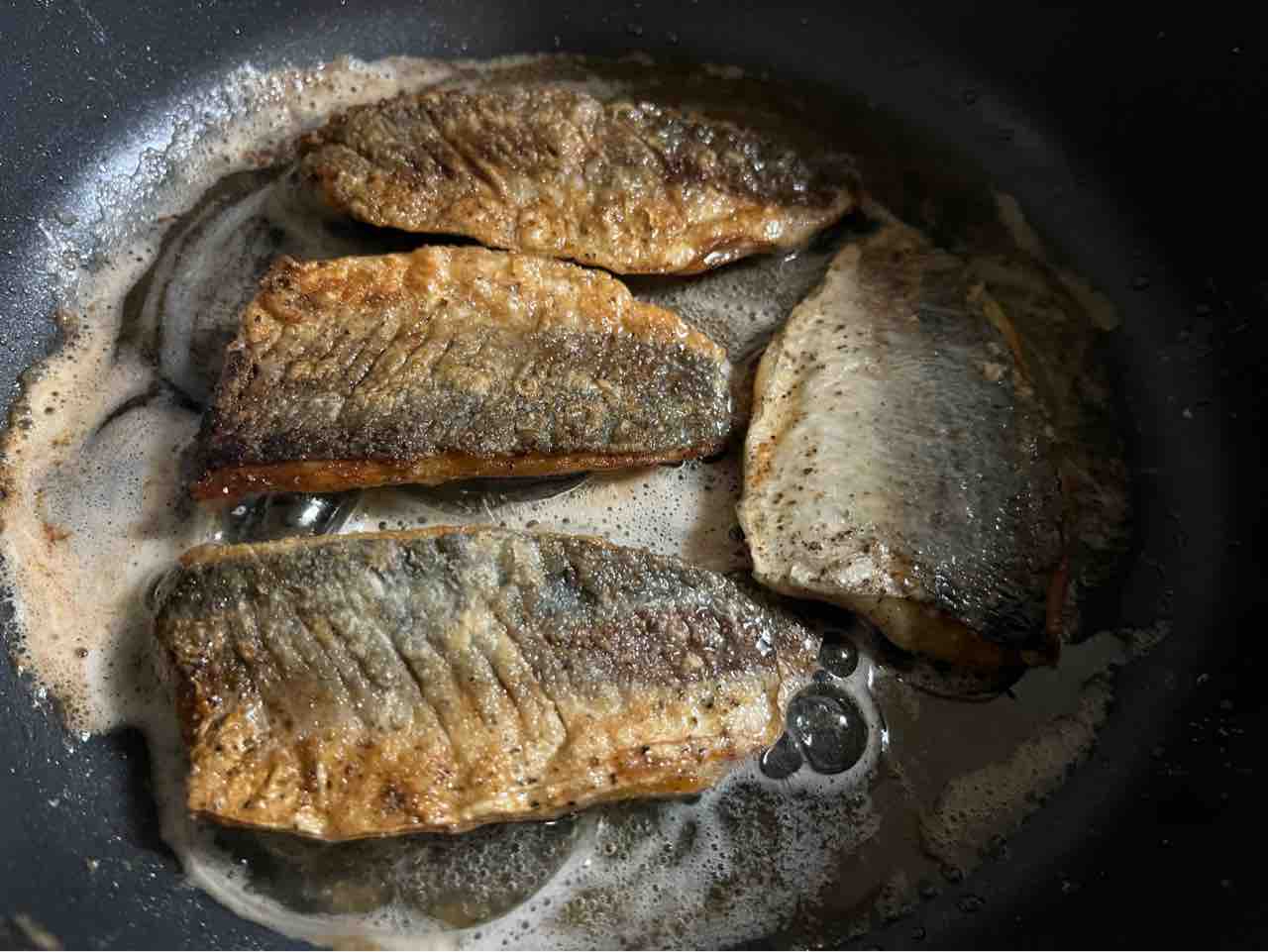 鯵に薄力粉をまぶしたら、バターと油を熱したフライパンで焼きます