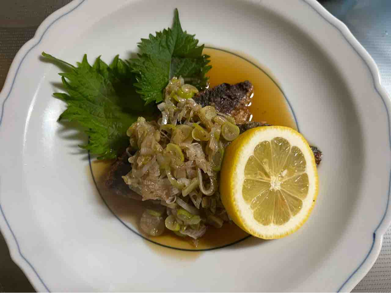 フライパンにバター適量を溶かし、ネギと生姜を炒め一味唐辛子をふったら鯵にのせます