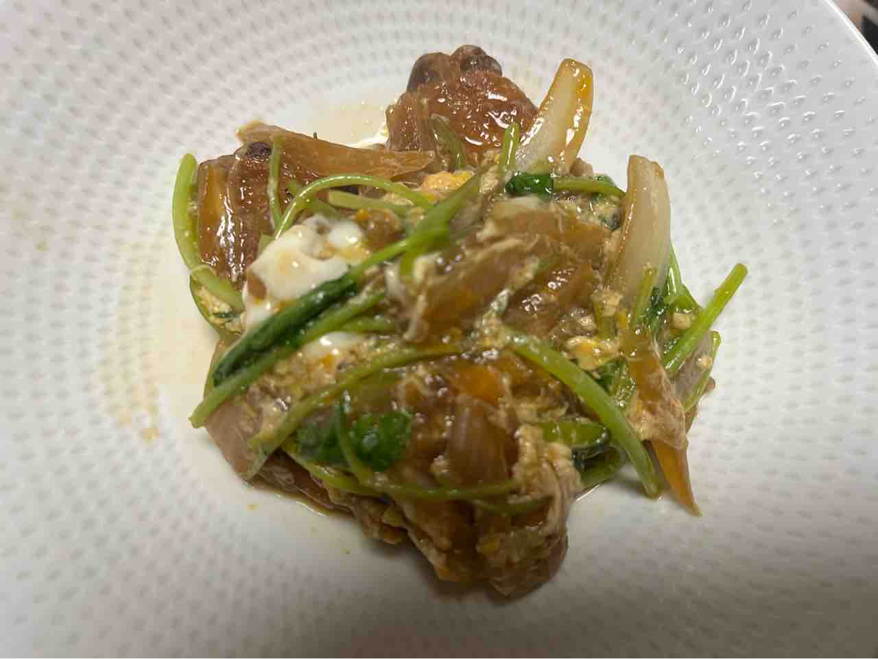 残った汁に玉ねぎの薄切りを入れて煮て行きます