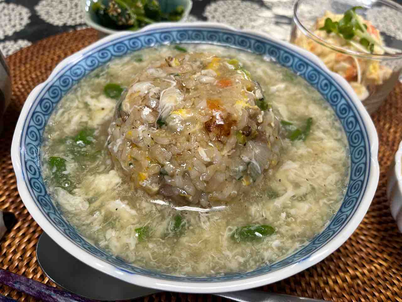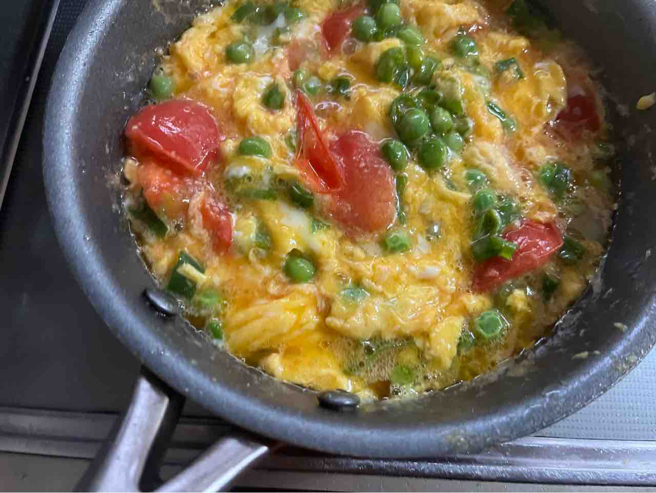 卵と塩茹でしたグリーンピースとネギを混ぜた物を、フライパンで半熟炒めにし一旦取り出します