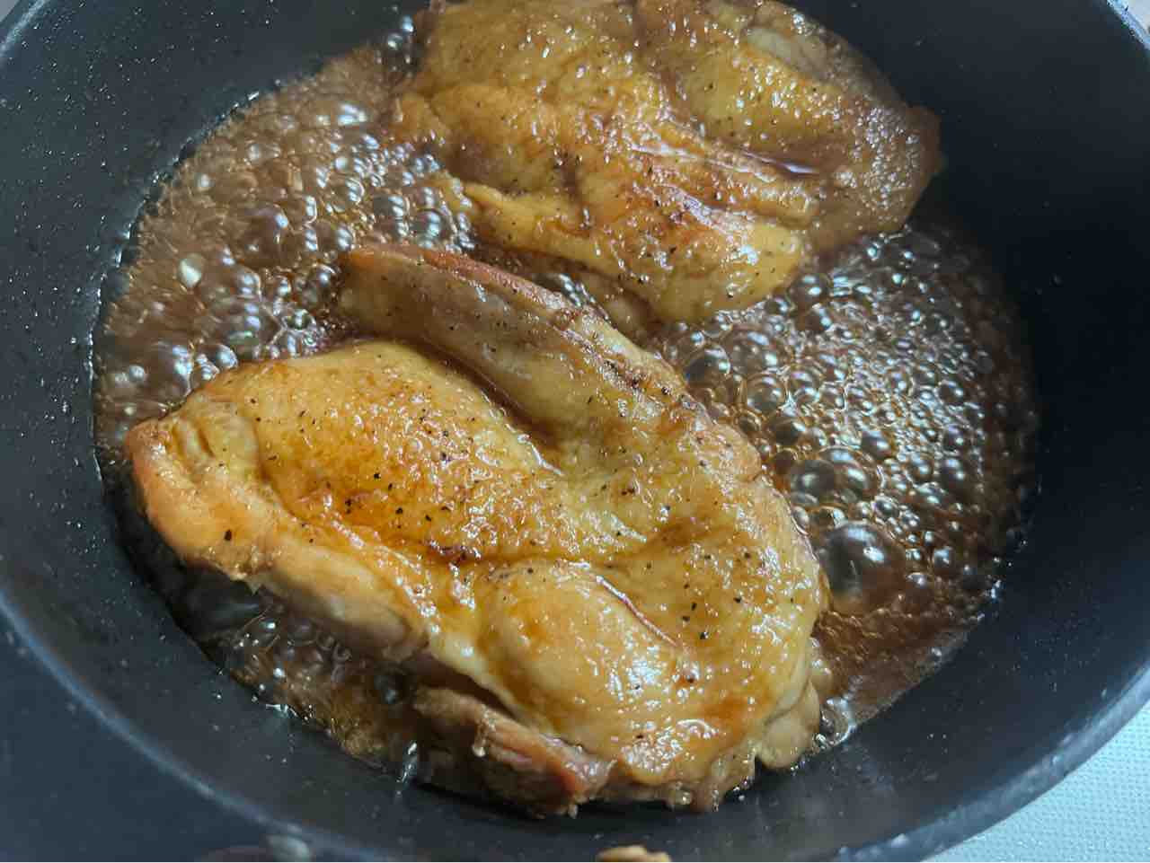 焼けたら、フライパンの汚れを拭き取り、タレ(黒酢、みりん、きび砂糖、醤油)を回し入れて煮絡めました