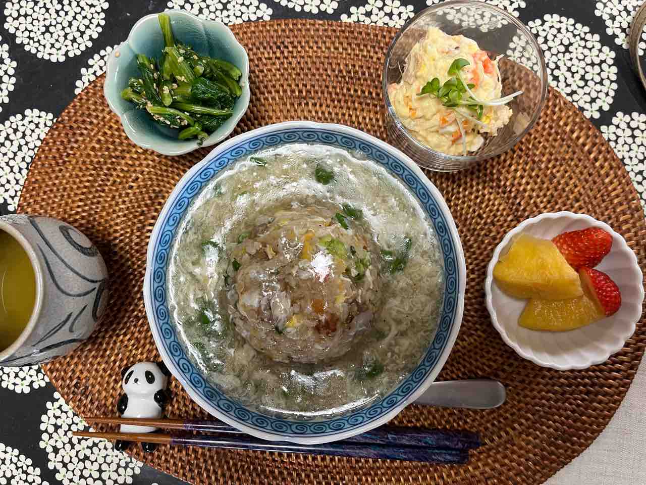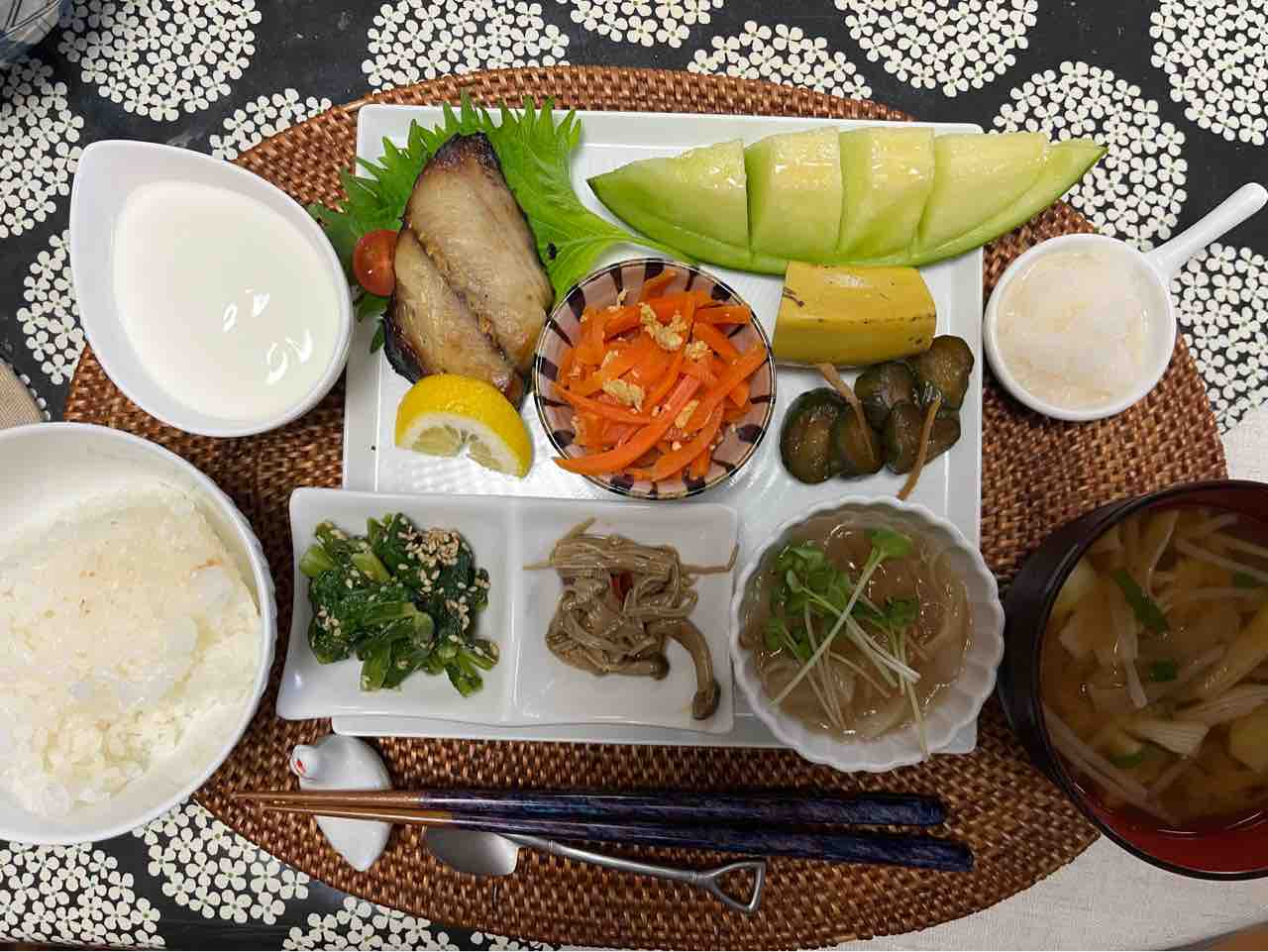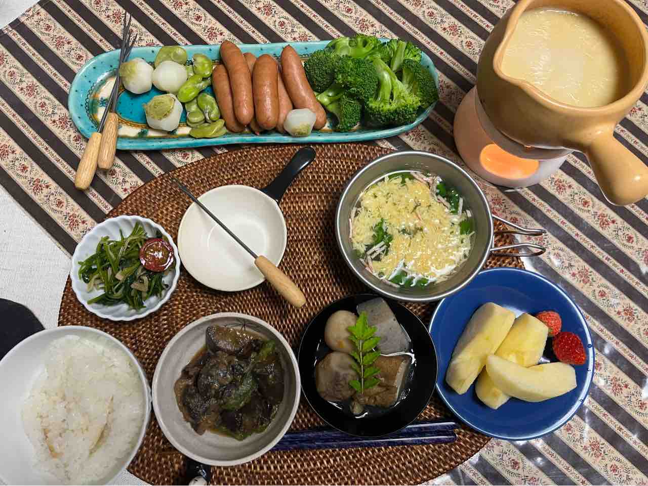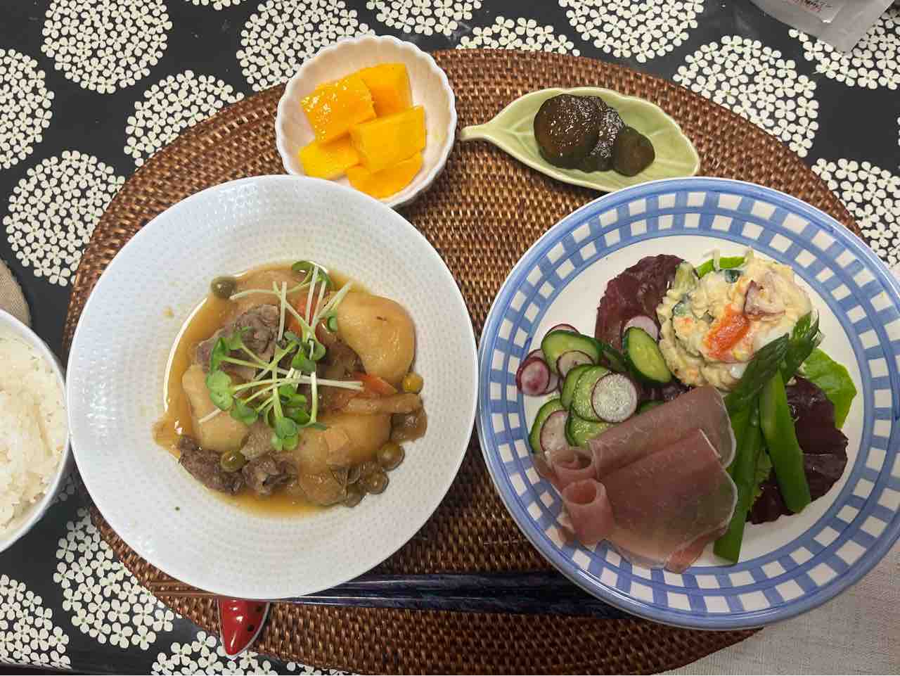 お昼ご飯は肉じゃが野菜サラダキュウリのキューちゃん漬けマンゴー土鍋炊きご飯