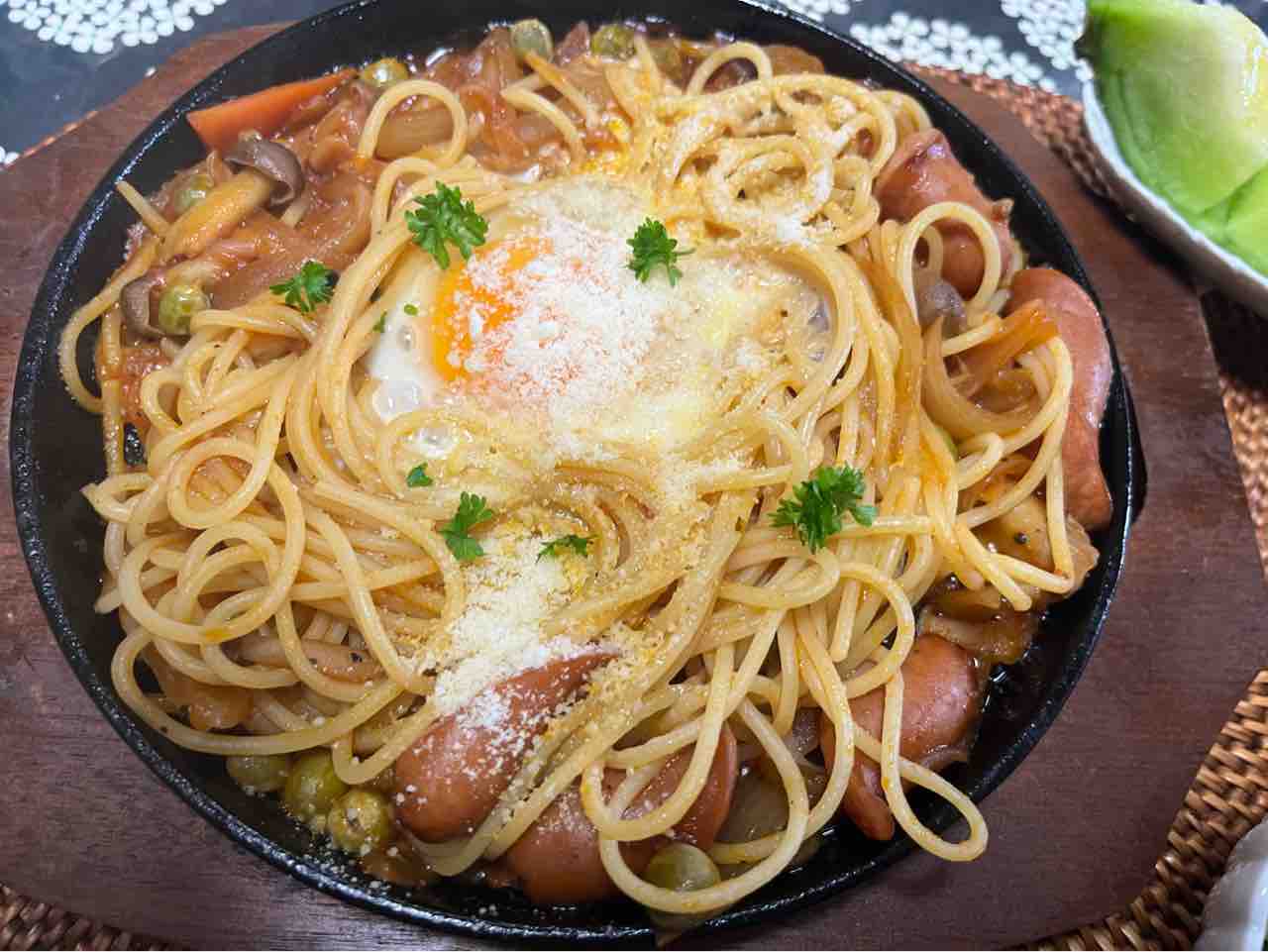 同じフライパンに油とトマトとニンニクを炒め、ここに取り出しておいた卵を加え塩コショウで味をつけて完成