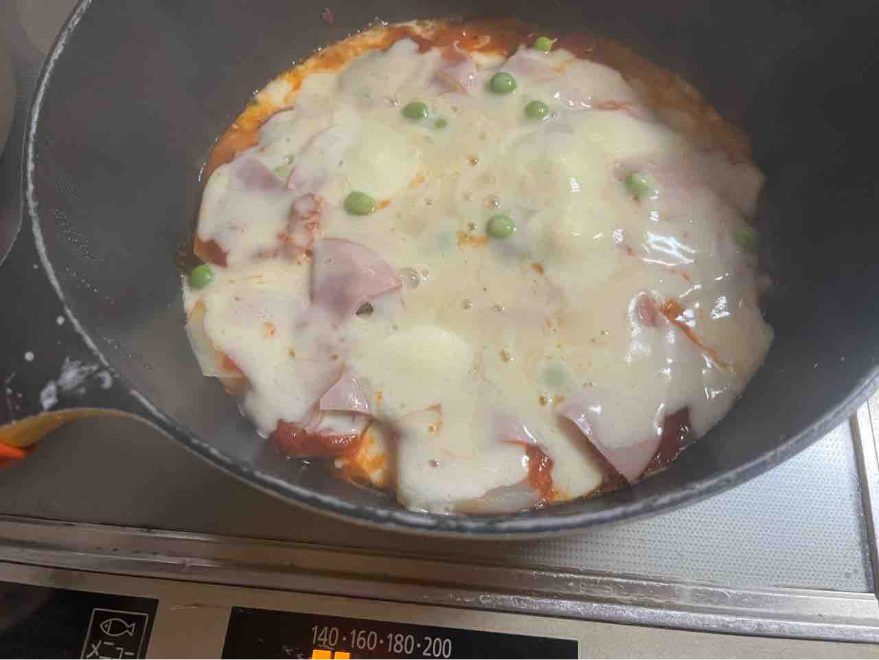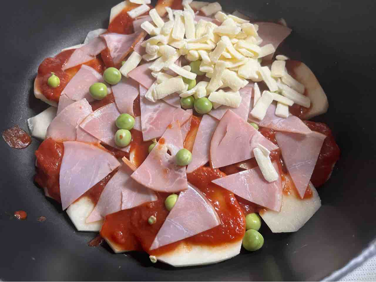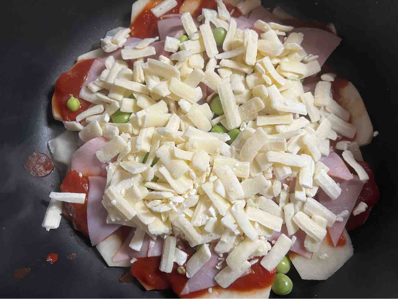 フライパンにオリーブ油をひいて、スライスしたジャガイモを置き、ピザソースを全体に塗ったら、ロースハム、グリーンピース、シュレッドチーズ、モッツアレラをトッピングして焼いていきます
