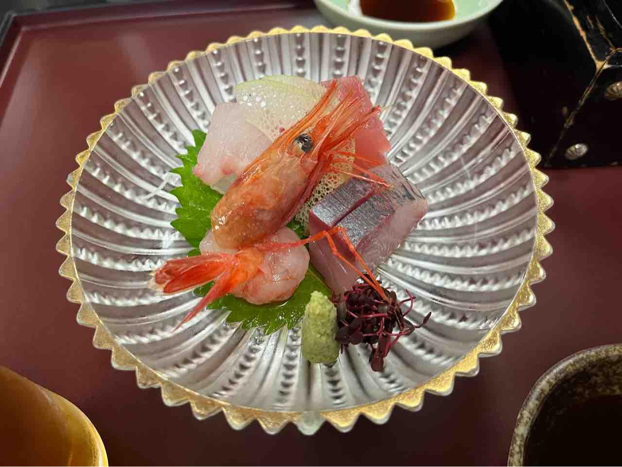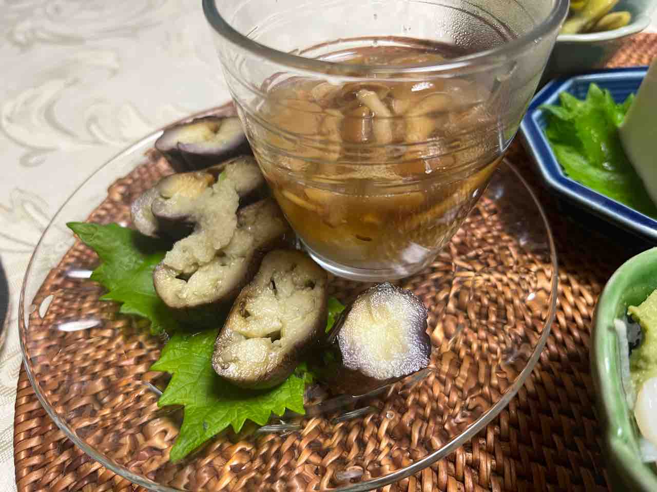 ガラスの皿には、蒸し茄子のポン酢生姜