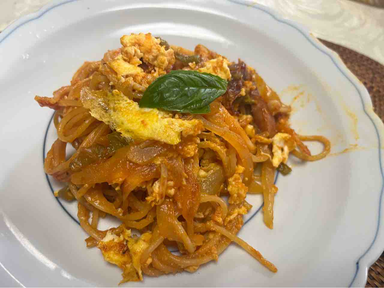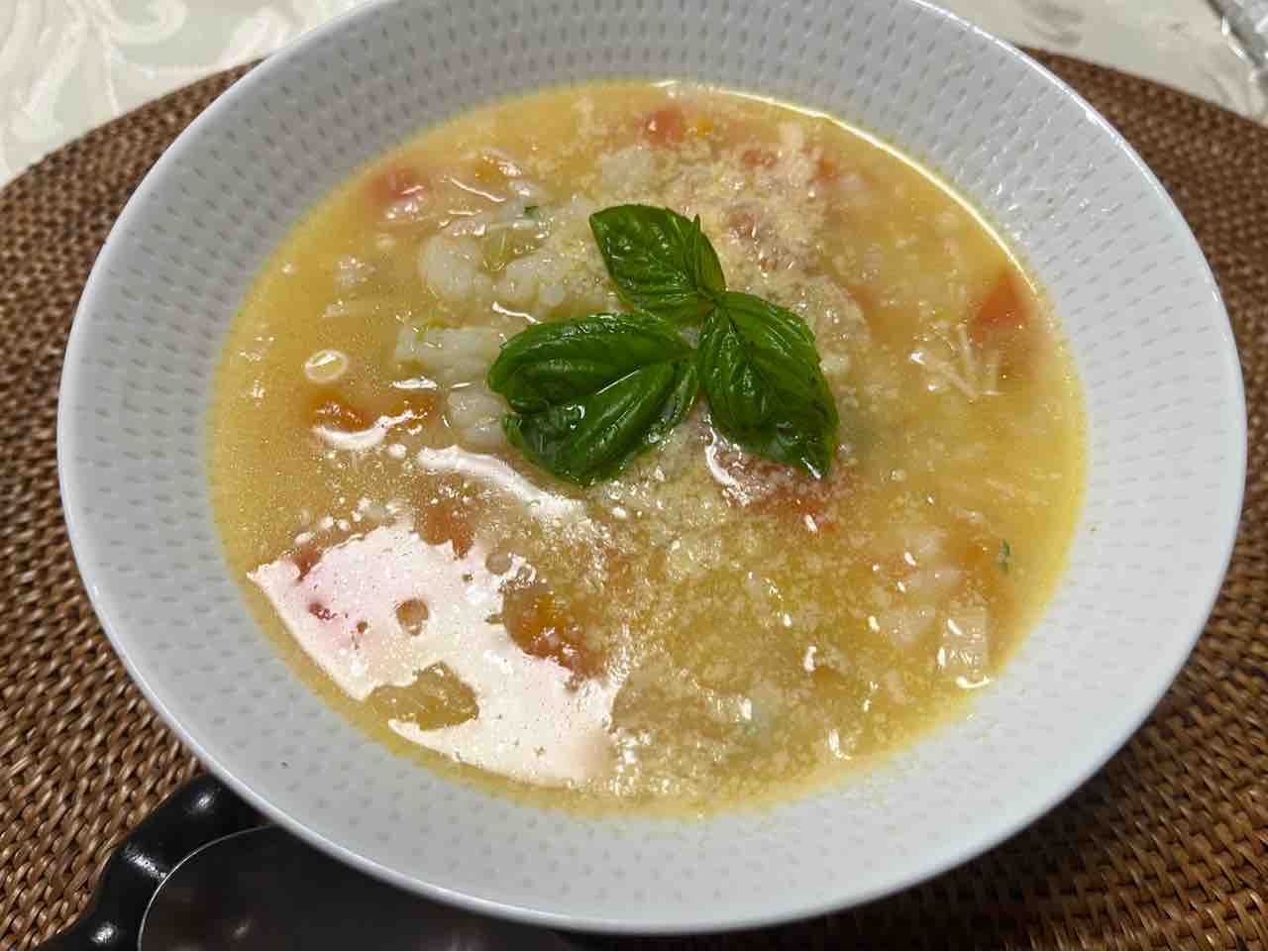 器に盛ったら粉チーズをかけ、バジルの葉を添えました