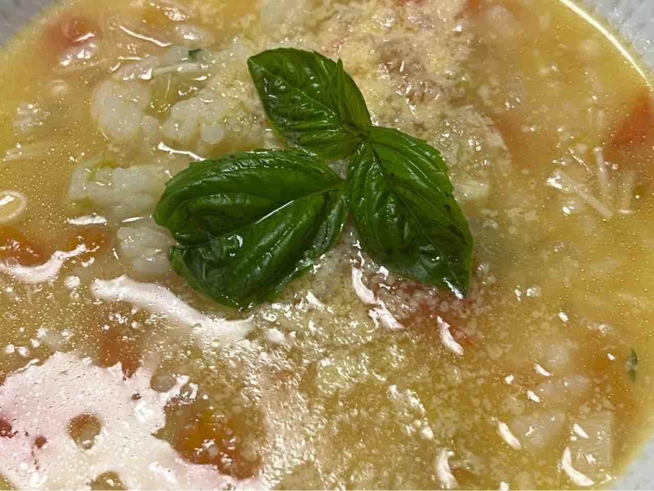 トマトのあら微塵切りを加え、コンソメスープを入れ塩コショウ