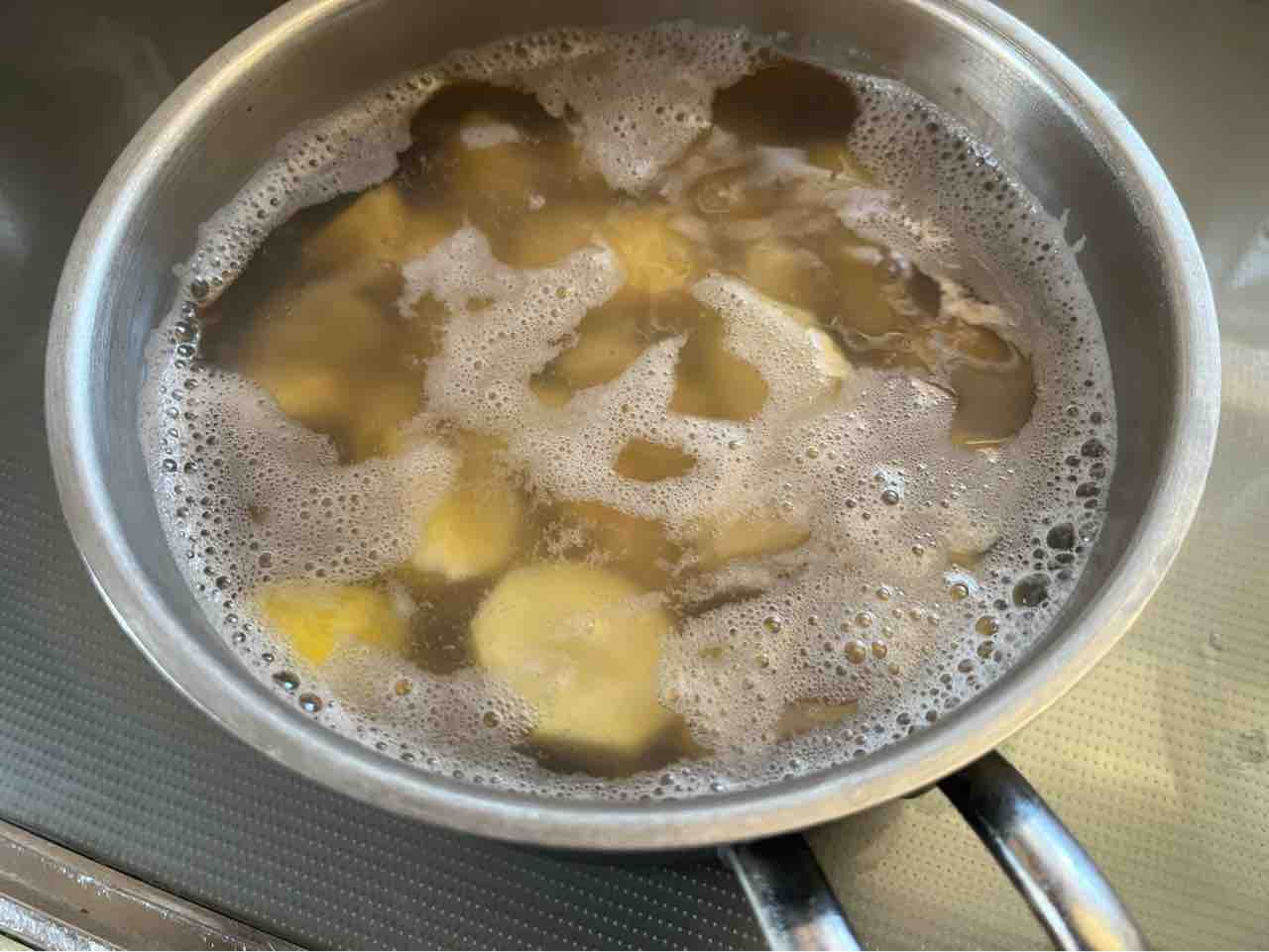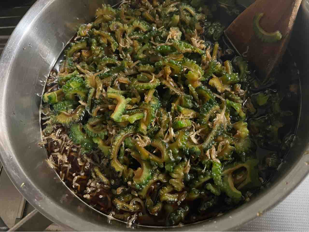 調味料を煮立て、中火にしてちりめんじゃこちゴーヤを煮る