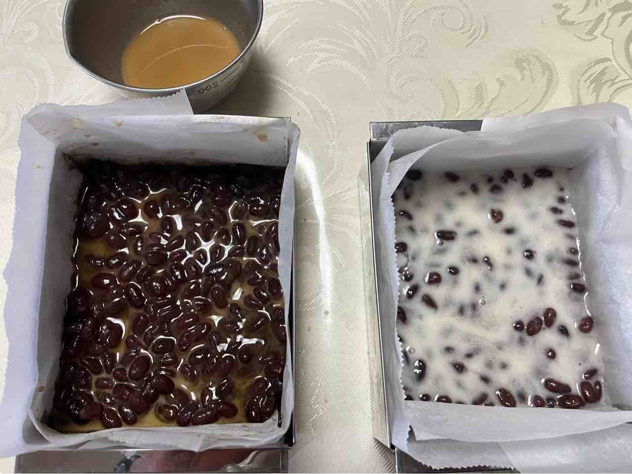5、蒸し器から取り出し、取り出しておいた生地を少量流し、全体に薄く広げたら、蜜漬け小豆を全体に行き渡るように置きます