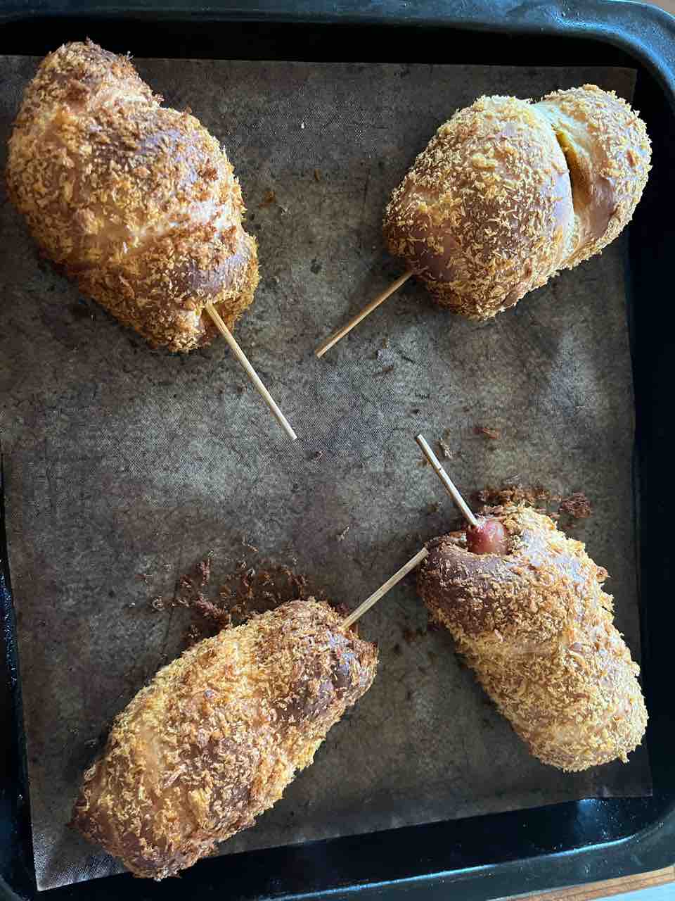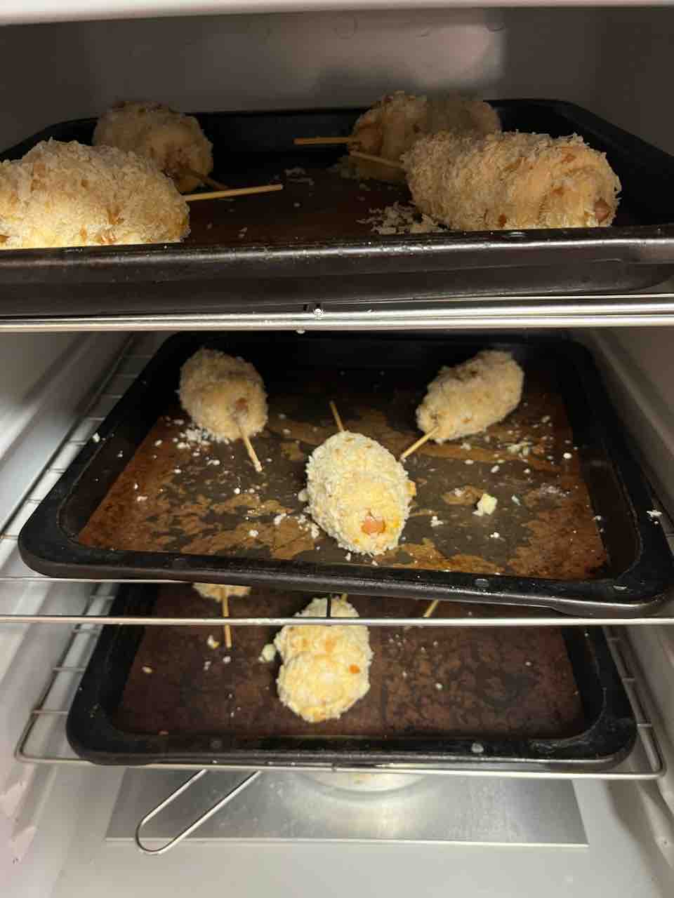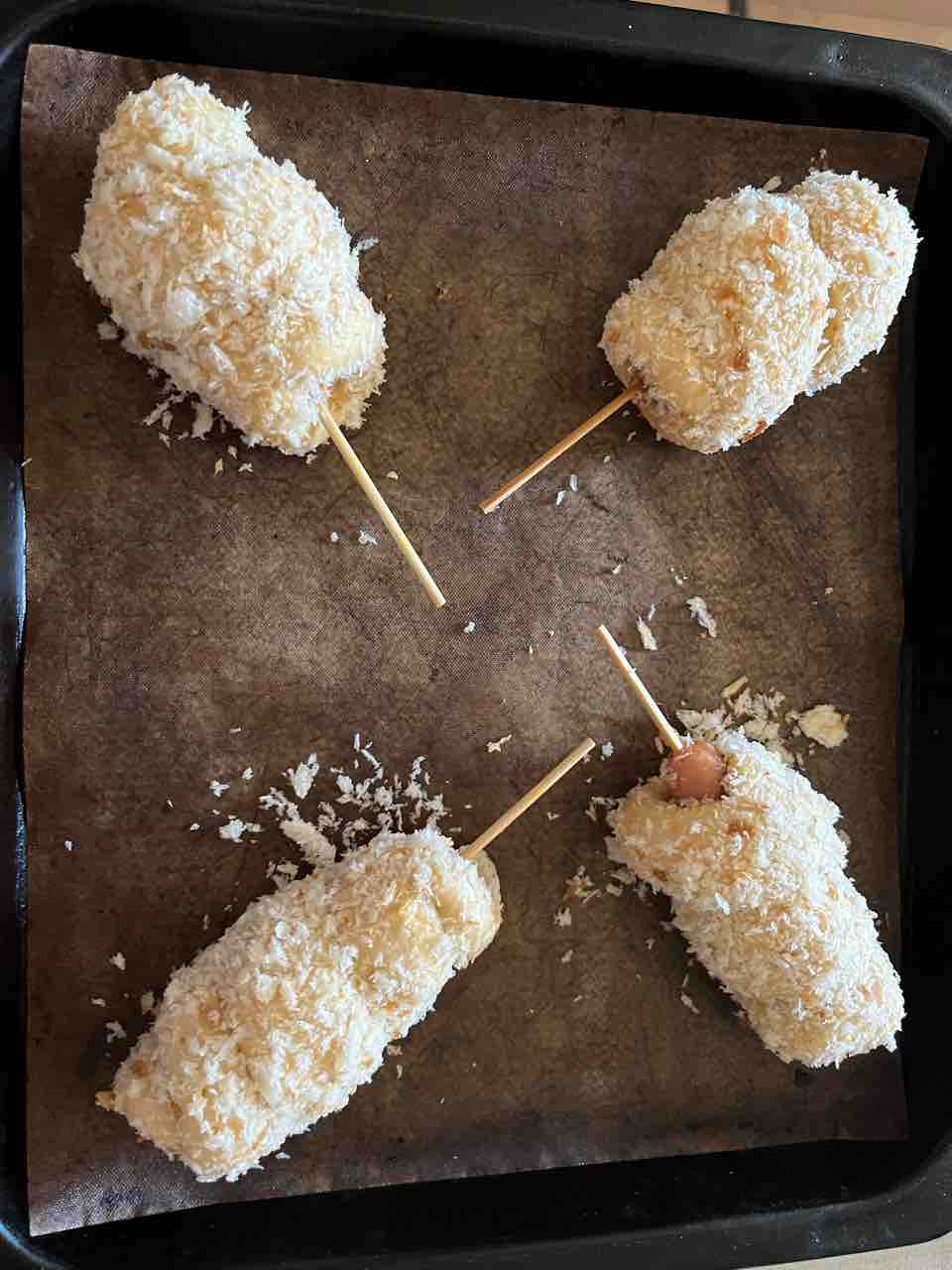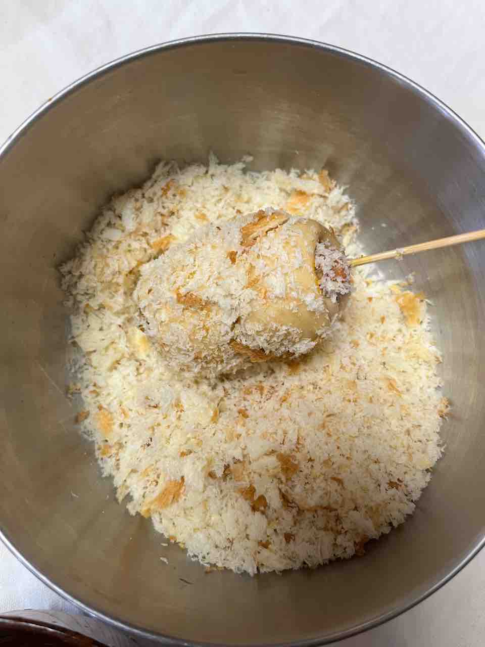 4、巻きつけたら水ハケして全体にパン粉をまぶします