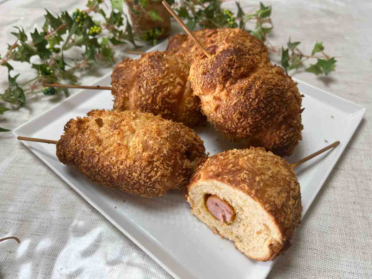 3、ベンチタイムが終わったら、ヒモ状成形しウィンナーにぐるぐる巻きつけていきます