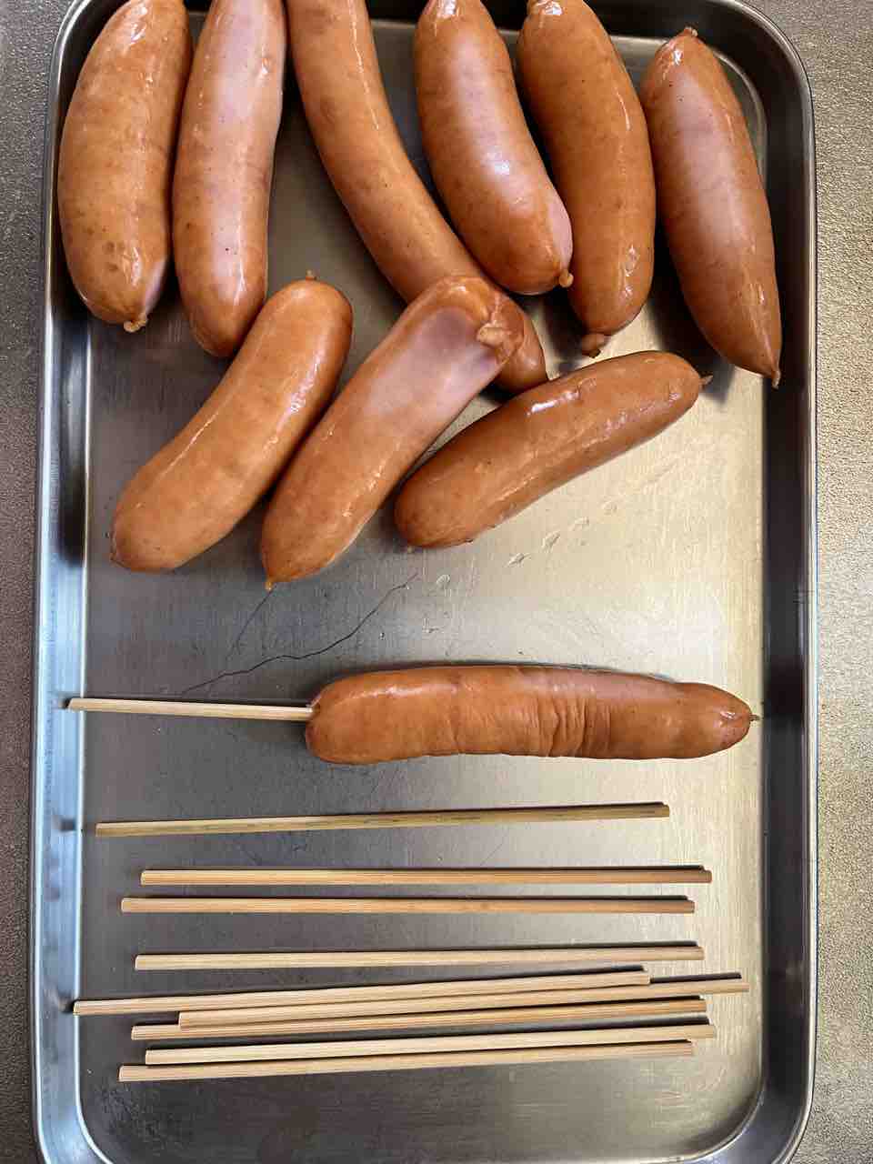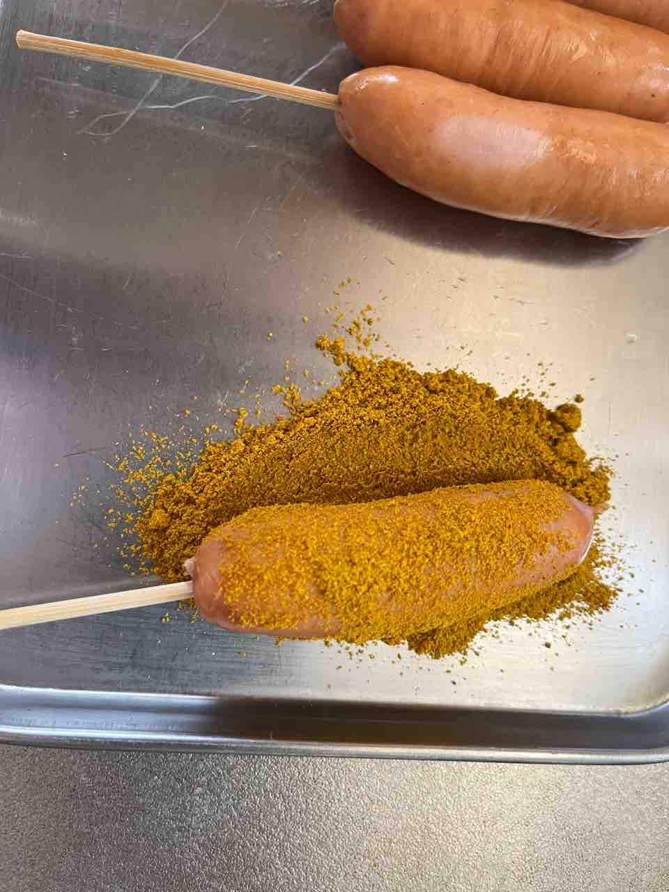 3、シャウエッセンに串を刺してカレー粉を全体にまぶしておきます