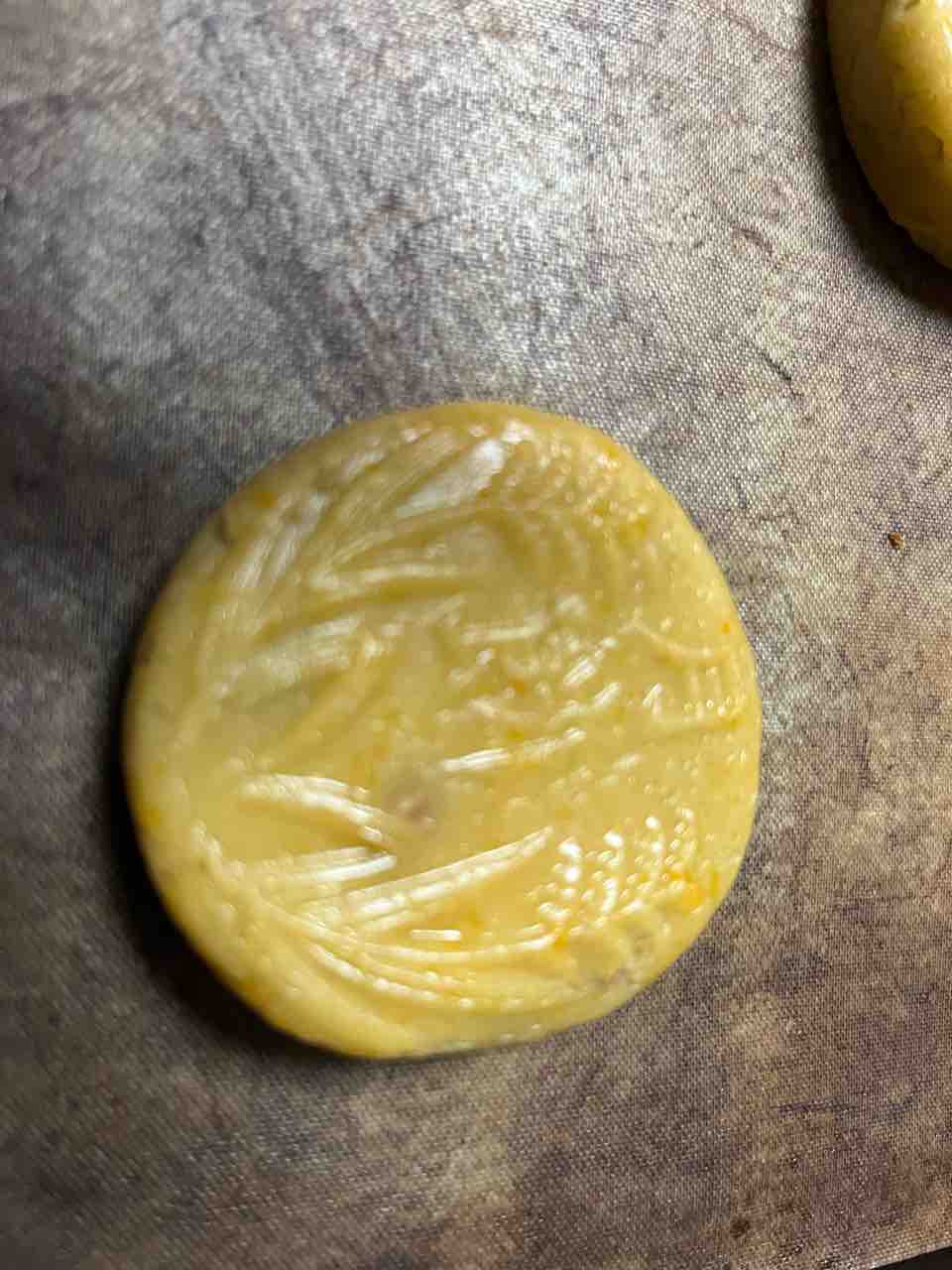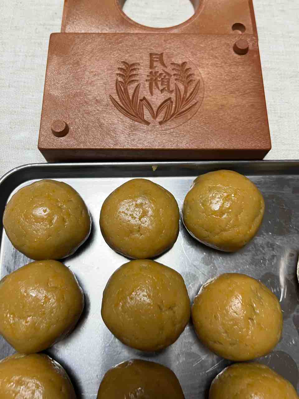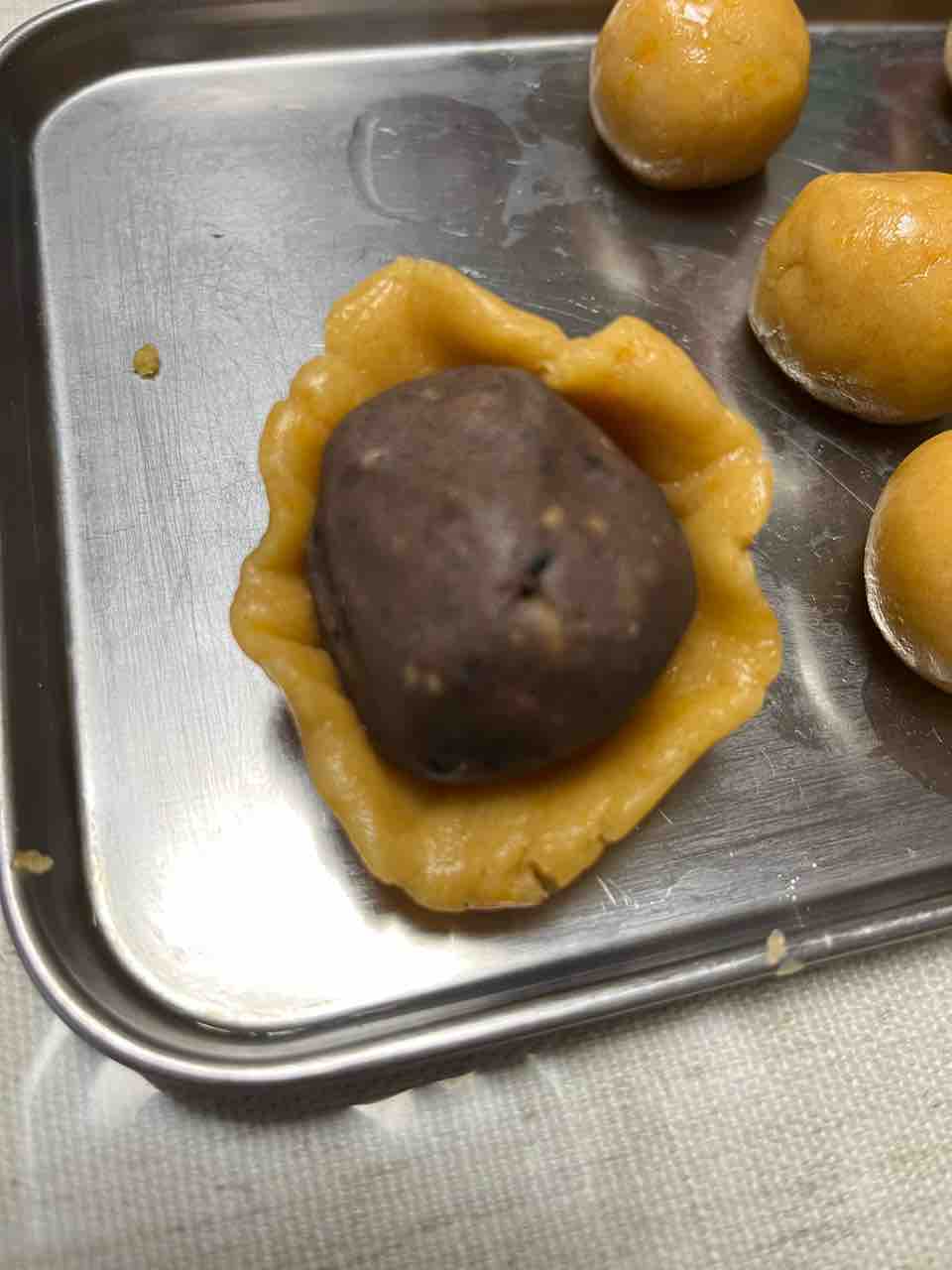 3、2に卵黄と太白胡麻油を入れて、白餡も少しずつ加えて混ぜたら、重曹(分量外の水でとかす)を混ぜる