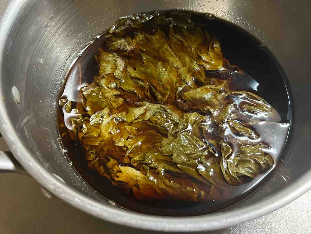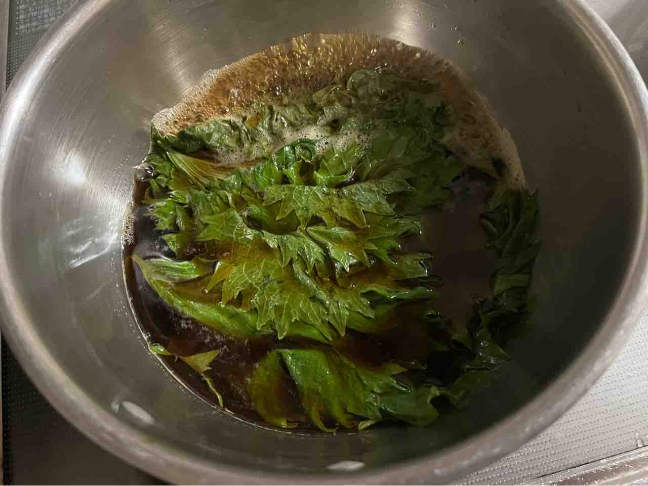 2、煮立って砂糖が溶けたら、青紫蘇と米酢を入れ再度煮立ったら火を止めます